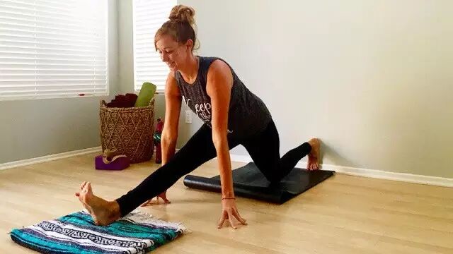 把一个瑜伽垫对折靠墙根放好,然后从低弓步进入哈努曼神猴式。让后面的腿踩在墙上,前面的后脚跟如果压力大可以放在一个毯子上。慢慢地让前面的脚跟向前方推,伸展双腿进入体式。注意感觉后脚的内侧和后脚跟和墙之间的对抗力。这样可以帮助左侧胯的外侧向前向下。