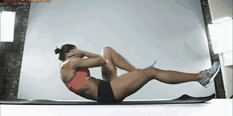 双臂伸平扶住大腿,做卷腹,令双手触到膝盖