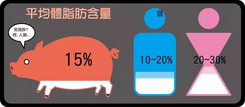 猪的平均体脂率只有15%左右,常做体测的大家都知道,成年男性标准的体脂范围,在15%-18%之间。而女性更高一些,在25%-28%之间。我们所谓的不吃猪肉其实也可以改为“不吃肥肉”。