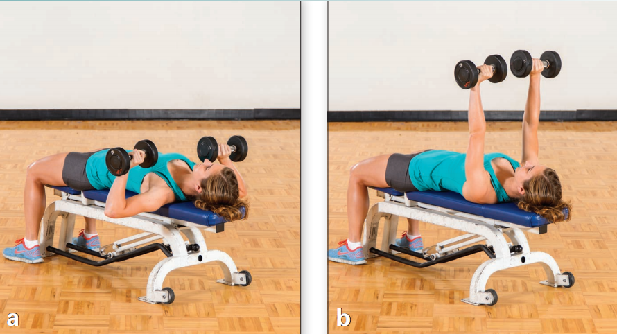 1.仰卧在平凳上,双手各握一只哑铃,同时双脚平放于地面。