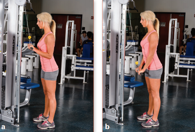 3.身体靠近滑轮,使两侧肘关节始终向下指,缆绳垂直。