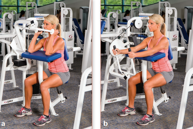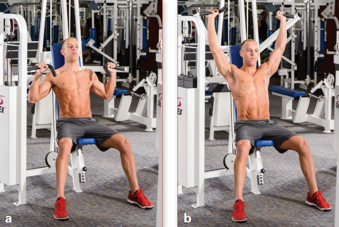 4.呼气,慢慢将把手上推,直至双臂伸直,但不能僵住不动。背部和头部始终紧贴靠背,且腰部 挺直。