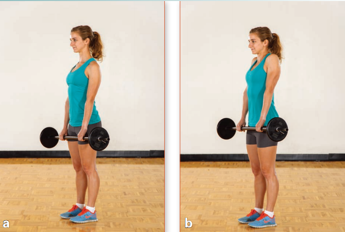 1.正手抓住杠铃杆,双手分开与肩同宽;将杠铃杆上抬,直至双手与膝盖齐平。