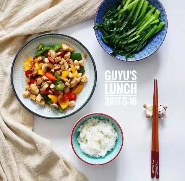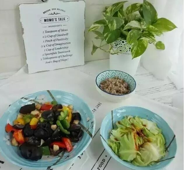 #13:彩椒木耳炒鸡丁+辣子圆白菜+十谷米
