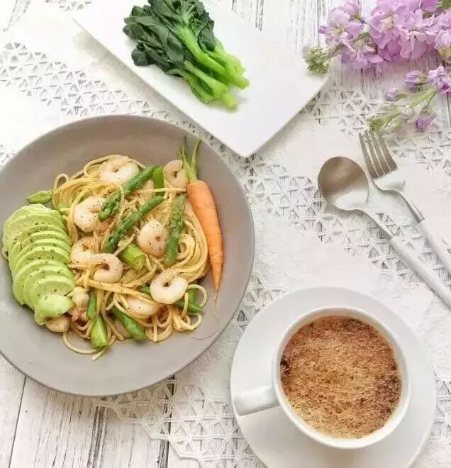 #04:牛油果芦笋虾仁意面+青菜+黑咖啡
