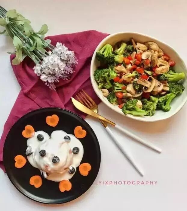 #02:鸡胸肉拌炒蘑菇西蓝花+红薯泥酸奶