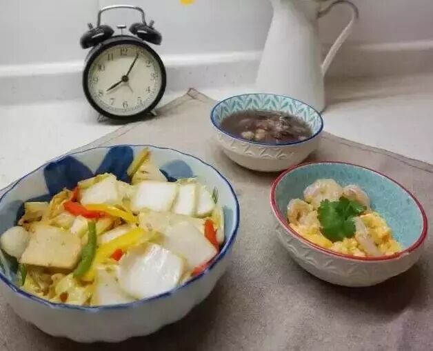 #05:滑蛋虾仁+白菜炒豆干+杂豆粥
