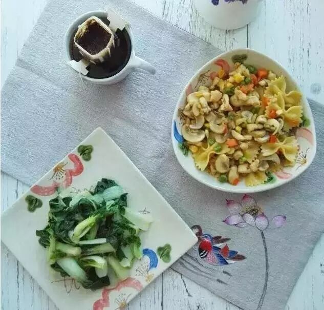 #14:鸡丁蘑菇炒意面+炒小白菜+黑咖啡