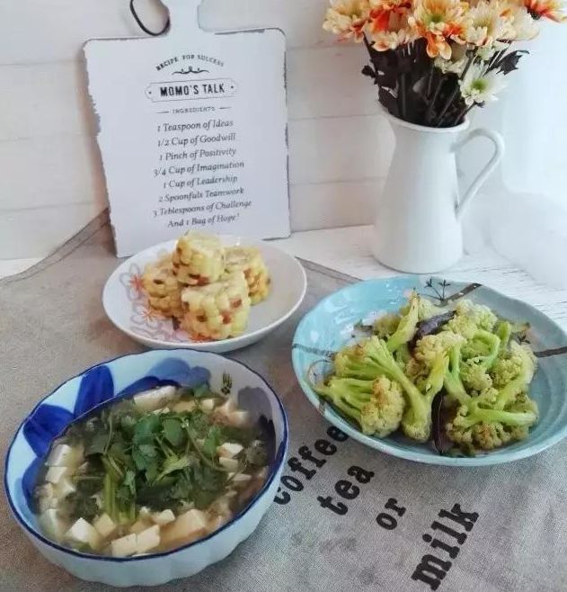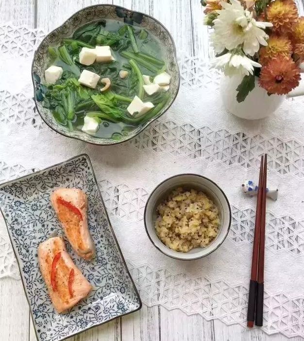 #09:菠菜豆腐汤+香煎三文鱼+藜麦燕麦小米饭