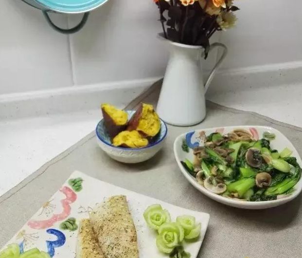 #03:香煎鱼柳+蘑菇小白菜+烤红薯