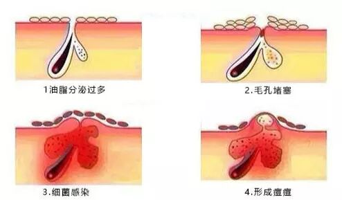 毛囊中的皮脂腺分泌大量皮脂,这些皮脂和脱落的皮肤细胞一起变成细菌和真菌等微生物。这些细菌在皮脂上繁殖,化脓呈凸状、红肿式溃烂等炎症,就形成了痘痘。