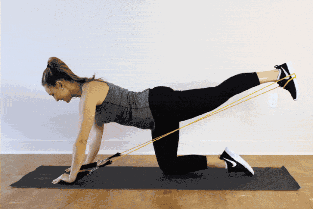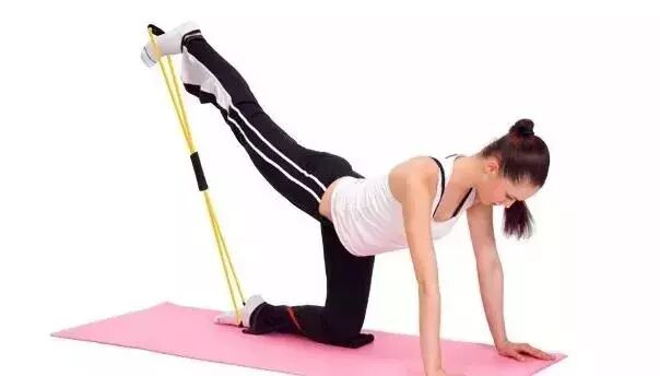 训练方法:弹力带置于脚掌心,跪姿俯卧双手撑地,呼气时右膝尽力向后方上侧伸展,收腿时吸气,整个过程控制身体平稳收紧核心。