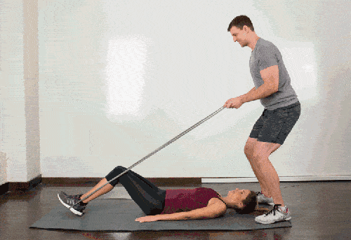 训练方法:固定一段弹力绳,吸气时双脚蹬弹力带至极限时;呼气时双腿回收至初始位置。