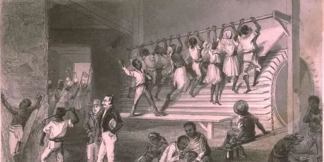 犯人们踩在巨大的桨轮上