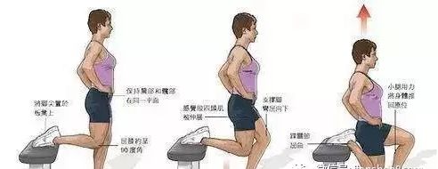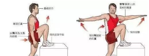 a. 以右脚踩上一个高跳箱或板凳,从髋部的位置让身体前倾,保持背部直立,左腿伸直,保持双脚平贴,双手置于身体两侧。