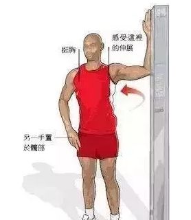 作法:站立在稳定的直立支撑物旁。将一手置于支撑物后,保持上臂与肩膀在同一平面。将身体慢慢向前推出,直到胸部肌肉有伸展的感觉。
