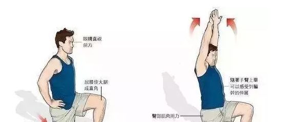 作法:身体直立,双脚打开与髋部同宽。将一脚跨过另一脚同时再将对侧的手臂高举过头以维持平衡。换边再重复这动作。