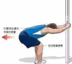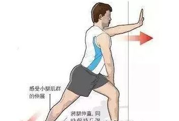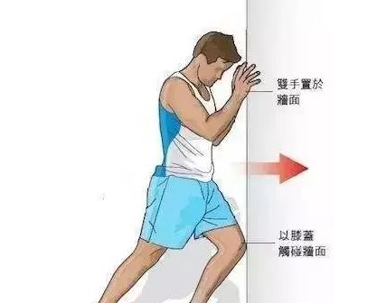 作法:采站姿于墙前约一大步的位置,手推墙壁,双脚站立与髋同宽。将左腿向前跨呈屈膝姿势,并维持左膝盖在脚的正上方,勿歪向一边。感觉右小腿肌群被拉扯到。换边进行左小腿的伸展。