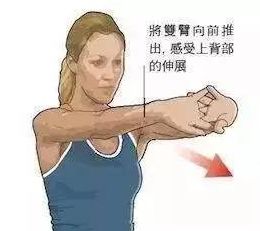 作法:手指交扣,掌心向外,将双手抬至胸前高度并伸直手臂,锁住手肘并将肩部向前推出。