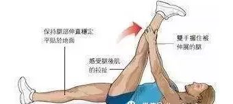 作法:平躺于地面,并伸直双腿。轮流将一脚抬起,并保持膝关节伸直固定,然后将脚趾头朝向身体方向拉。