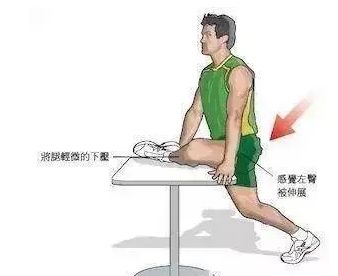 作法:背对桌子站立。将左脚背置于桌面,保持两侧大腿平行。微微的将髋部向后倾斜,感受左大腿前侧的股四头肌被拉扯。维持此姿势几秒,放松,然后换边进行。