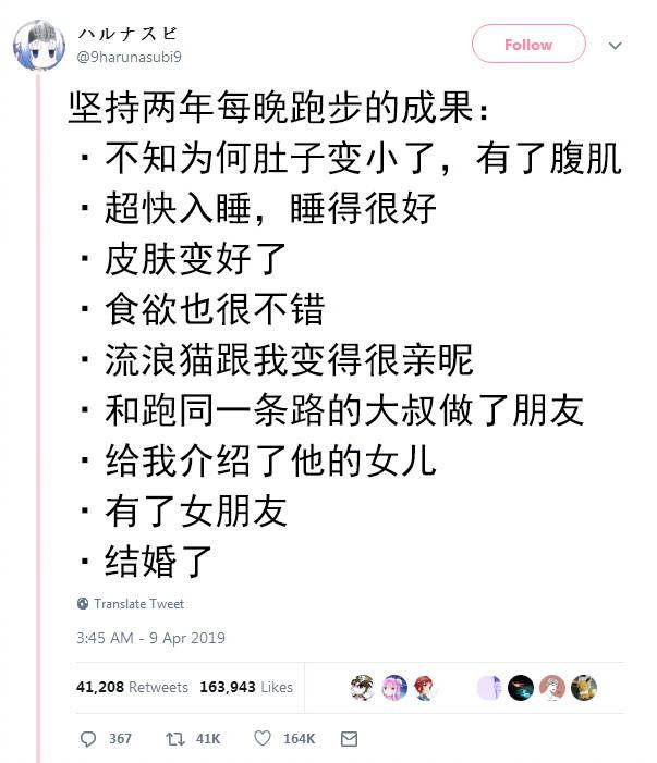 而且,早上要跑步,就注定了不能赖床。既然不能赖床,那么晚上就不会熬夜。这样坚持下来,早睡早起,生活会更规律一点。