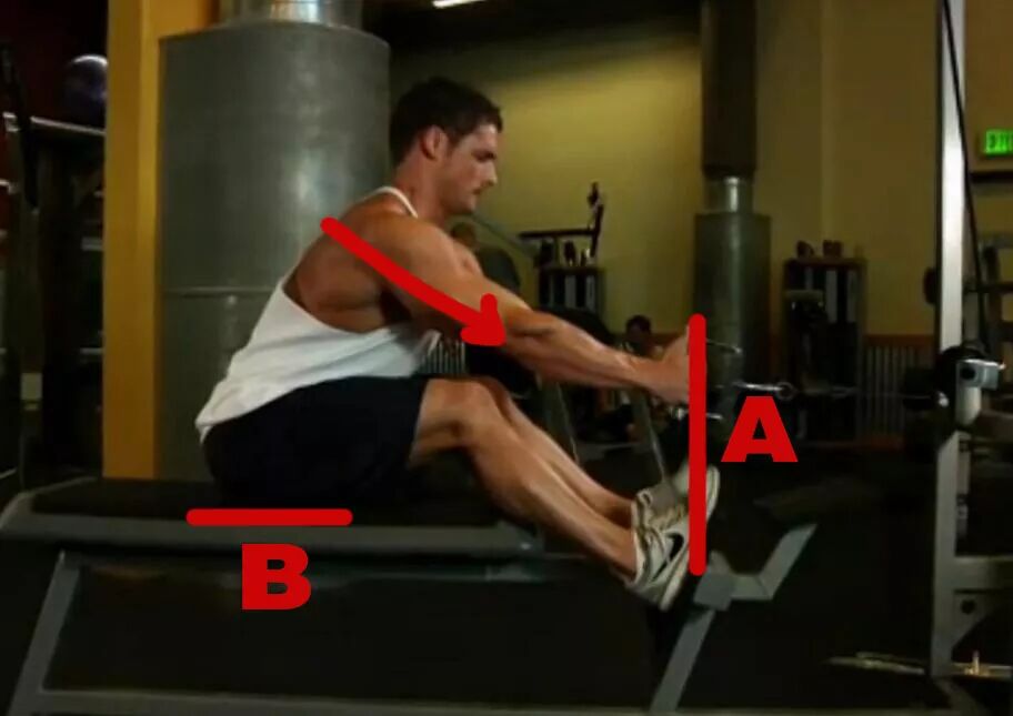 准备动作比较容易掌握,要点在于两个部分,第一根据自己的身高找准坐的位置(B),这个位置恰好手握握把(A)的时候手位置的水平面不超过脚尖,这样做的原因是因为尽量不让我们的尾椎以及L5,L4腰椎过度负重伸展,造成不必要的损伤。