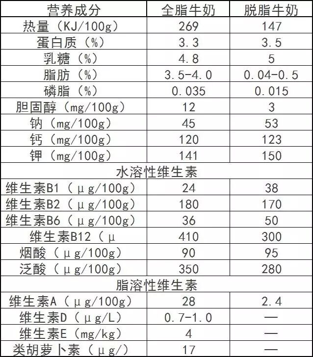 下面,可以看一组全脂牛奶和脱脂牛奶的营养成分对比图▼