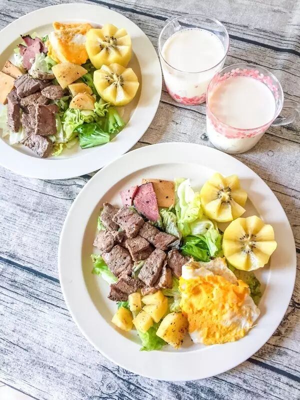 牛肉+煎蛋+蔬菜沙拉+猕猴桃+牛奶