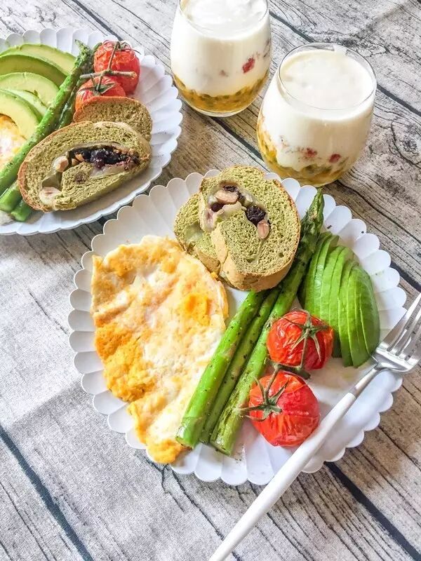 煎蛋+芦笋+烤小番茄+牛油果+抹茶麻薯软欧+百香果酸奶