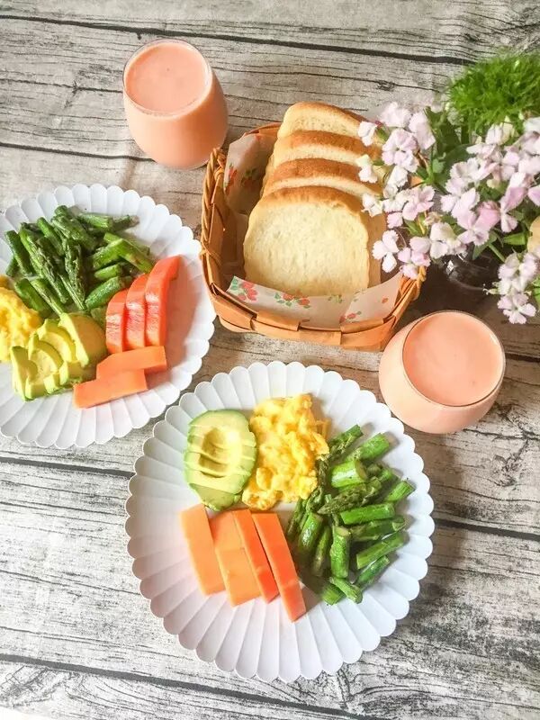 滑蛋+牛油果+芦笋+木瓜+面包+木瓜奶昔