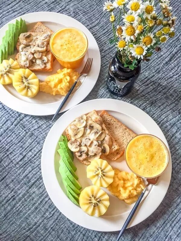 芝士口蘑烤吐司+牛油果+猕猴桃+滑蛋+鲜榨橙汁