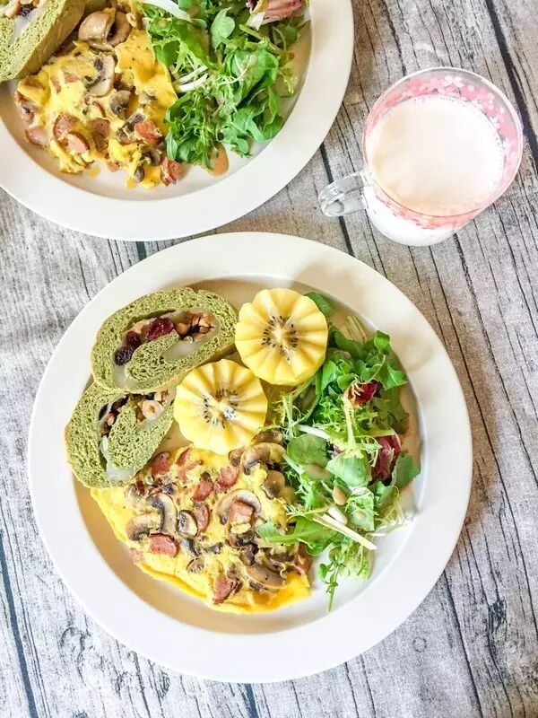 香肠口蘑蛋饼+猕猴桃+蔬菜沙拉+抹茶麻薯软欧+牛奶