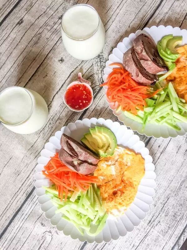 青瓜丝+胡萝卜丝+煎蛋+牛油果+软欧+牛油果奶昔