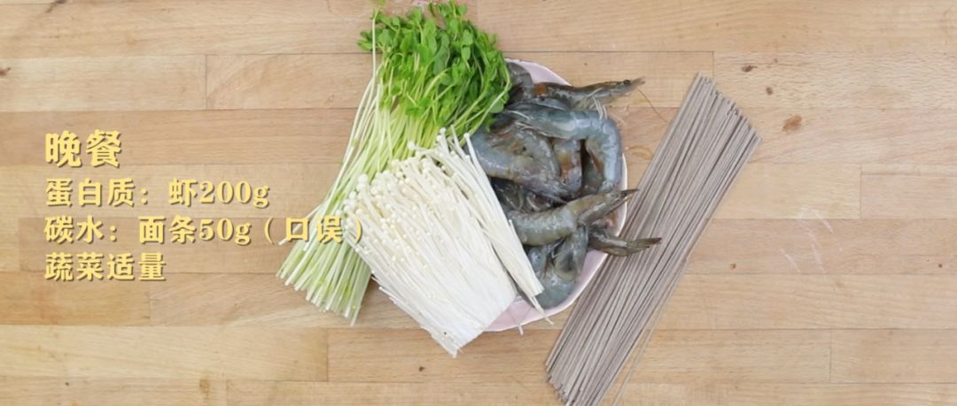 晚餐:200克虾+生重50克面条+菜苗和金针菇,你可以用他们做一个很简单的海鲜汤面.