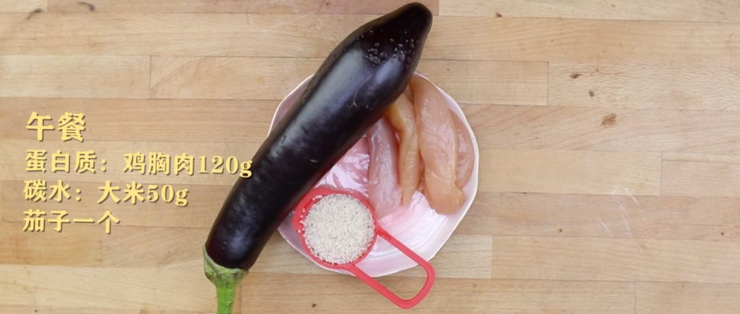 午餐:120克鸡胸肉+生重50克大米+茄子,我之前做过一个泰式茄子鸡胸肉.