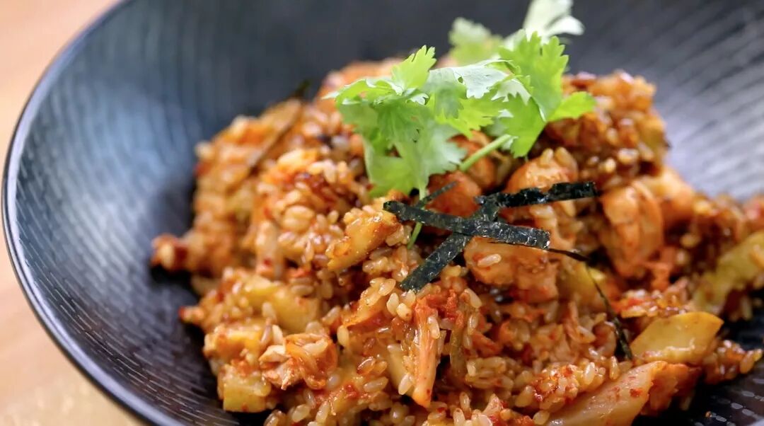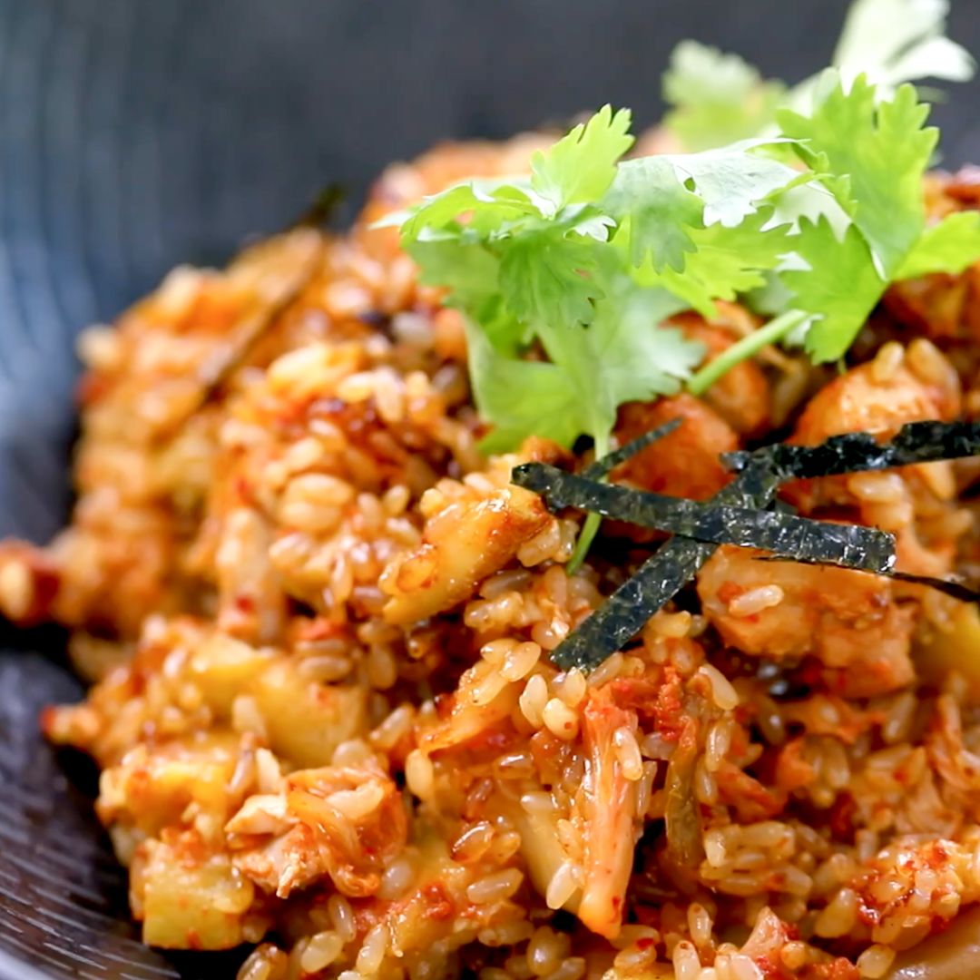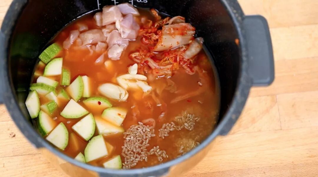 辣白菜、鸡腿肉、切大块的西葫芦、一点姜丝和糙米,放进电饭煲内胆中。加水没过食材就可以,加一小勺辣椒酱搅拌均匀,放进电饭煲的普通煮饭模式。最后可以加一点海苔丝装饰。