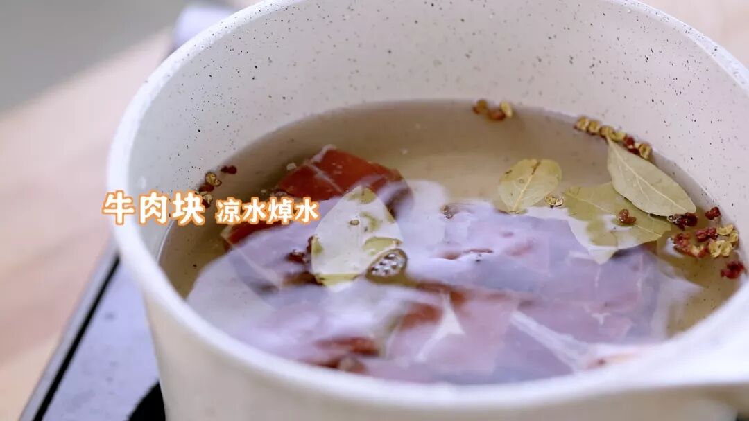 牛腩加香叶、花椒和料酒焯水去腥。豆角处理后切断,放进电饭锅内胆中,加入切块的土豆、切丝的洋葱和糙米。加水刚刚没过食材就可以了,加生抽、蚝油和一点姜黄粉调味。放进电饭煲的普通煮饭模式。