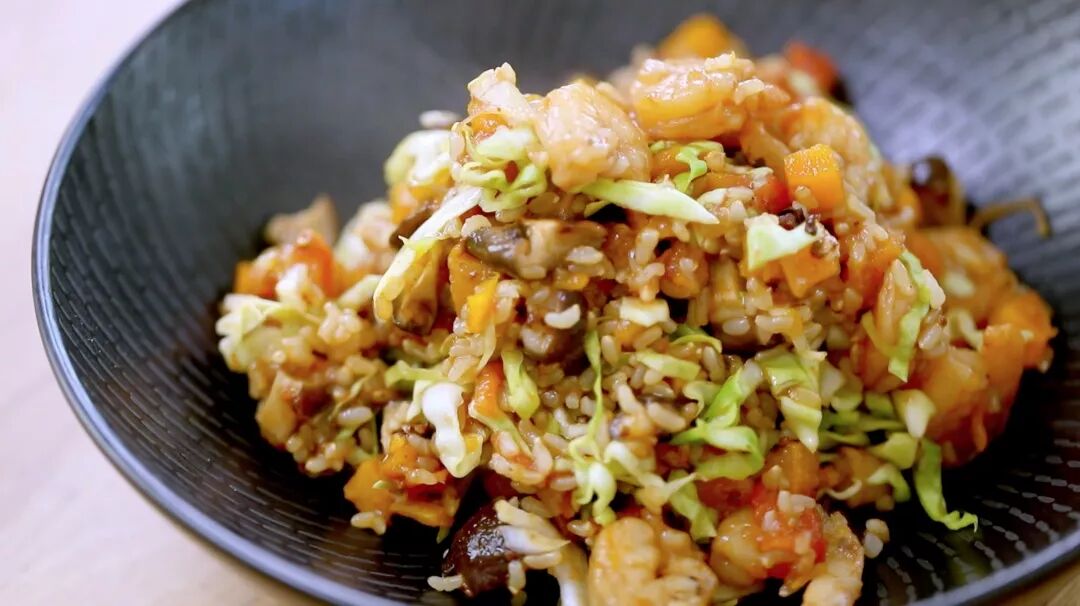 番茄切十字花,放在电饭锅内胆中间,旁边放上虾仁、切块的香菇、切块的胡萝卜和糙米。加水刚刚没过食材就可以了,加盐和白胡椒调味。放进电饭煲的普通煮饭模式。最后出锅前,把切好的圆白菜丝放进去,再余温闷5-8分钟就可以啦。