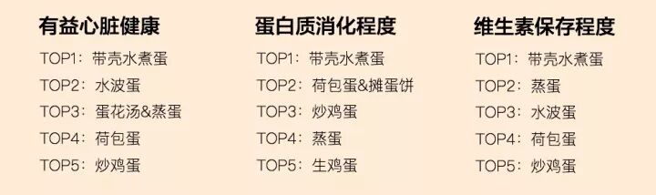 不难看出,不管在哪个榜单,“带壳水煮蛋”都排名第一——不加一滴油,烹饪温度低,营养全面保留,蛋白质消化率高,是最健康的吃法。