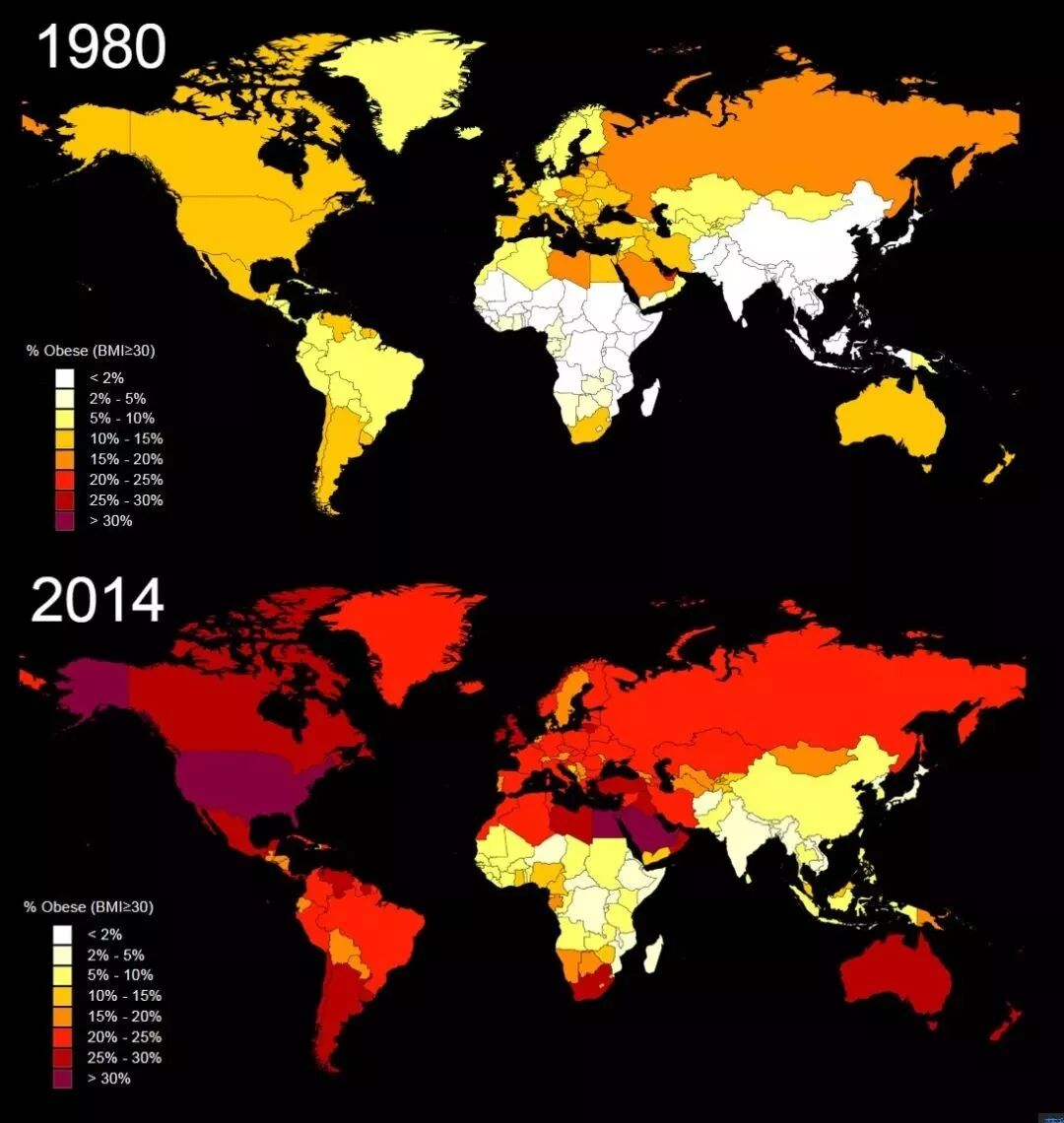 并没有,从1980年开始,世界各国的肥胖率