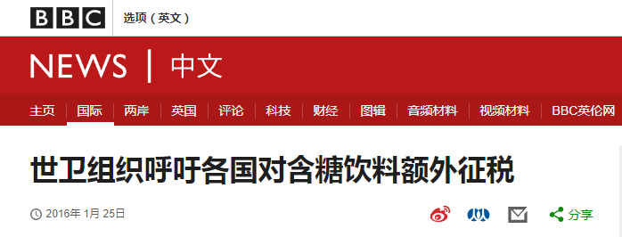 2016年,世卫组织呼吁各国对含糖饮料额外征税