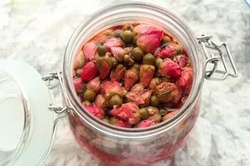 将未全开放的玫瑰花朵,泡入香醋中,放置一星期左右,待香醋将玫瑰完全软化即可使用啦!!
