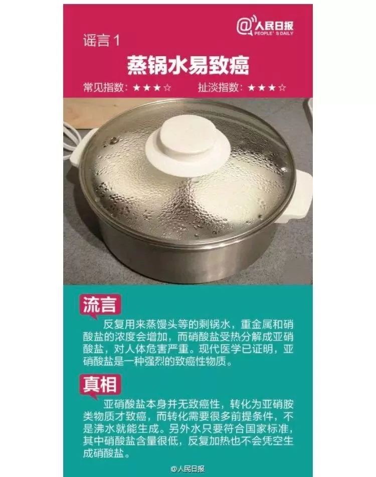 所以有人认为,经过了反复蒸煮的水里,含有大量亚硝酸盐,会有致癌的风险。这种类似的说法通过社交媒体的扩散,影响了一大批中老年人。