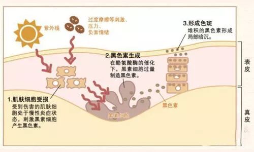 紫外线照射能激活酪氨酸酶活性,使黑素细胞增殖和活性增加增强,使黑色素合成加速,引起颜面部色素沉着。