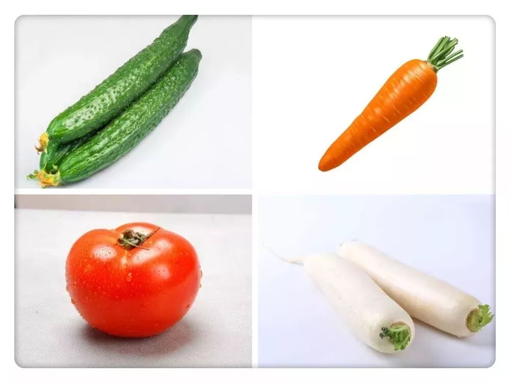 这里给大家推荐生食蔬菜四件套:黄瓜、西红柿、胡萝卜、白萝卜。这四种蔬菜热量都极低,水分含量高。作为零食完全不用担心热量超标问题,放心大胆地吃就好了。