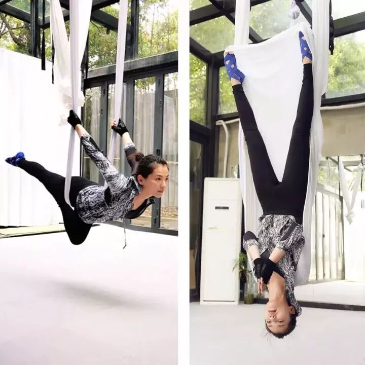 她练习的空中瑜伽,对于力量控制和平衡协调性都有很高的要求。