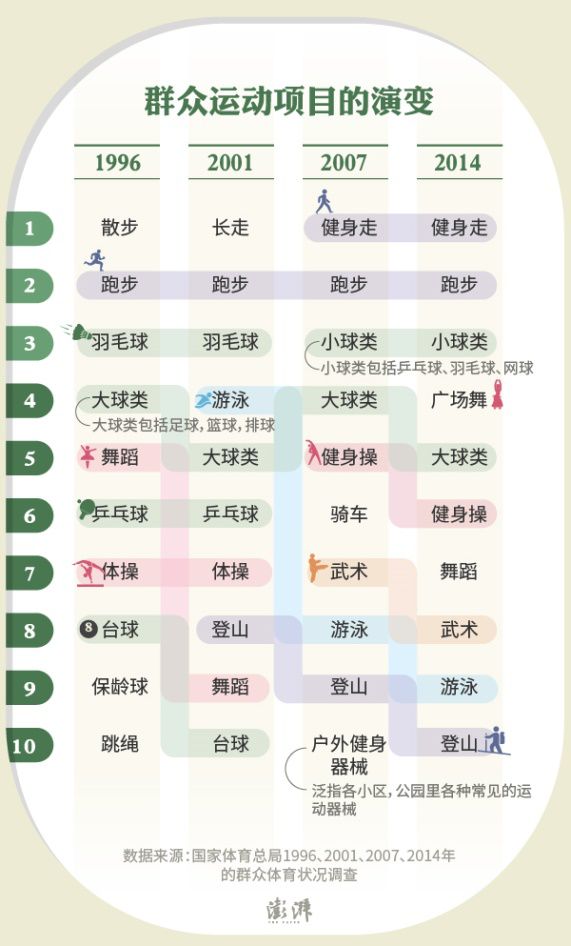 据国家体育总局对国人体育项目的调查,散步类运动(包括散步、健身走、长走)是长年稳居第一的“国民运动”,第二名也是雷打不动的跑步,而广场舞是最近几年才开始兴起的。