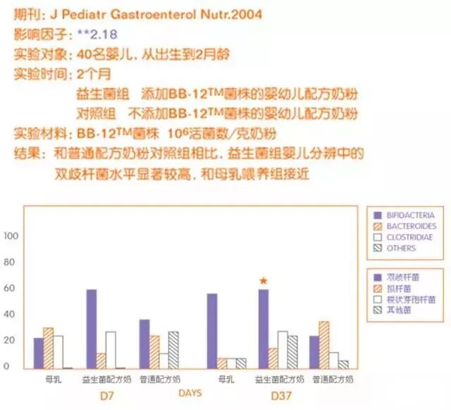 专家对40名出生到2月龄的宝宝持续2个月投入BB12益生菌配方乳、母乳、普通配方乳做对比。