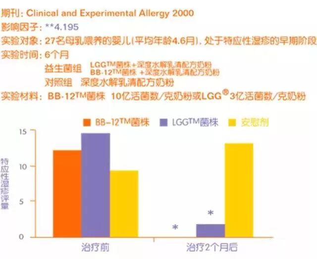 专家对27名母乳喂养,平均4-6个月,患有湿疹的婴幼儿连续6个月投入BB-12菌株、LGG菌株、安慰剂(深度水解乳清配方奶粉)对照。